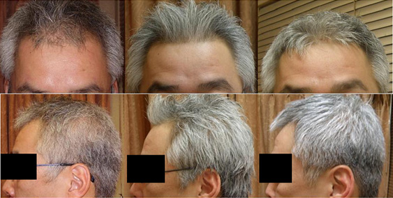 ② 前頭部の毛髪が切れ毛・細毛で伸びず短かったのがしっかりとボリュームが出て長く伸び始めた。側頭部の毛の量ボリュームも共にアップした。