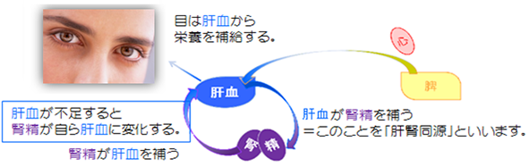 最後に、血を主る肝が疲労などで消耗すると、目まで栄養を送ることができなくなり、視力減退・眼精疲労を生じます。すなわち、肝血が不足した時は肝血を補うことで目も同時に回復します。また、肝は生命の源である「腎」と深い関わりがあります。その為、肝血が不足すると腎は腎精を血に変身させて肝血を補い、反対に腎精が不足すると肝は肝血を精に変身させお互い補い合うことで機能を維持します。これを「肝腎同源」・「清血同源」といい、眼疾患との繋がりもあります。